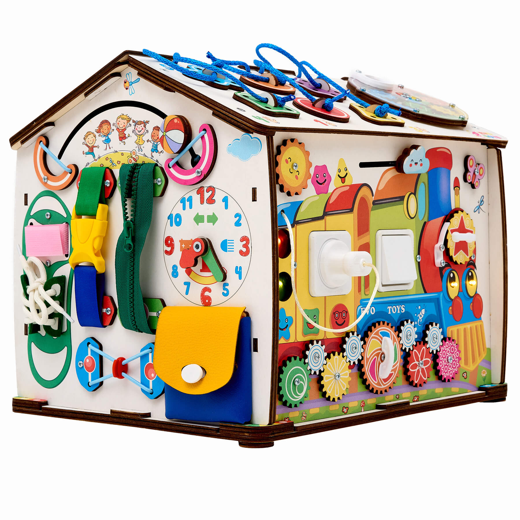 Главный элемент – забавный паровозик с колесами-шестеренками с удобной ручкой для вращения влево и вправо. На вагоне расположены две разноцветные лампочки и двухклавишный выключатель для их включения. На кабине находятся вилка с розеткой, которые зажигают фары поезда, и трещотка, стимулирующая межполушарное развитие мозга ребенка. Над паровозиком помещены лабиринт с тучкой и подвижное солнышко для укрепления пальчиков рук малыша.